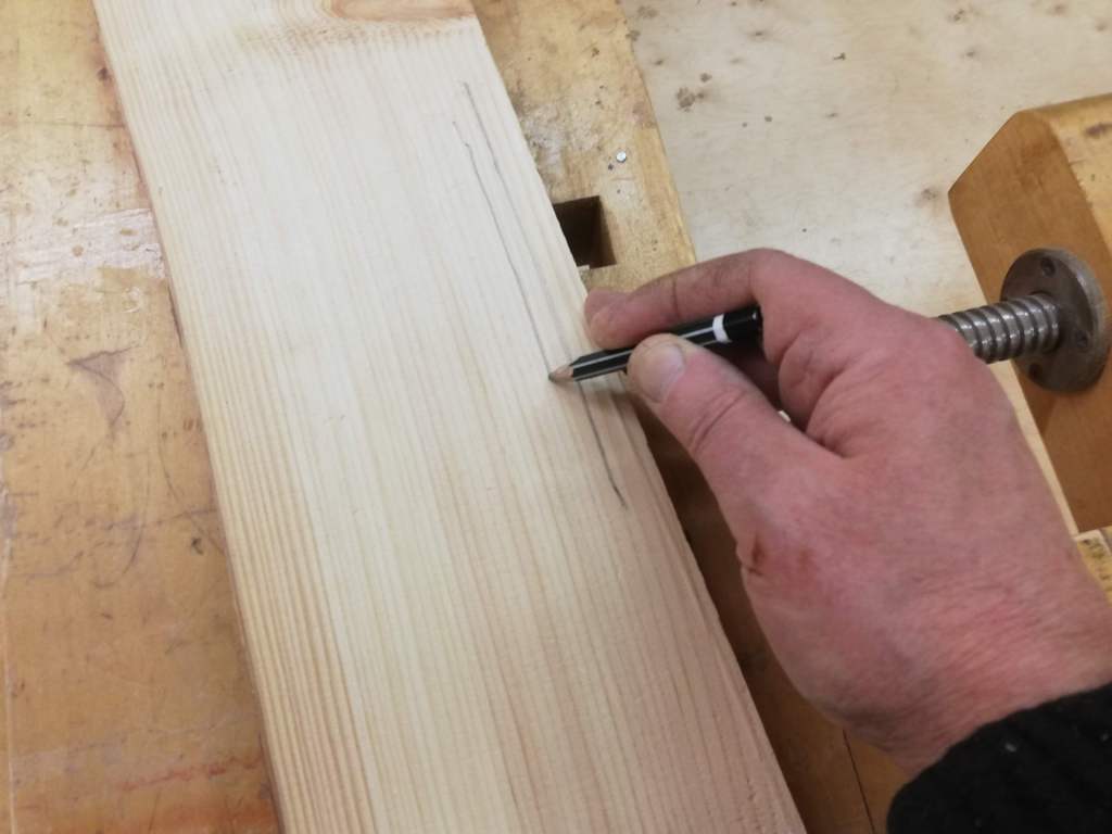 Väga lihtne meetod detaili äärega paralleelset joont tõmmata. “juhtsõrm” toetub materjali äärele ja pliiatsi nurka hoiame paigal. Väga täpne ja lihtne meetod. Rööbits on meil kõigil (taskus) olemas.