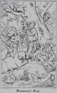Vanake laulis taeva suurusest ja maa toredusest, Emajõe kallaste ehetest ja nende endisest toredusest, inimeste soo õnnest ja õnnetusest. Laul liigutas tema südant nõnda, et tal pisarad silmist veeresid, mis läbi kuue kuue ja seitsme särgi tungisid. Ja siis ruttas ta Vanataadi eluhoonetesse temale laulma ja mängima. Pühadel kõrvadel on õnneks antud mõne korra kõrgelt ja kaugelt ta mänguhääli kuulda. Et inimesed laulu hoopis ära ei unustaks, saadab ta aeg ajalt käskjalad veel praegu maa peale maha. Ta isegi tuleb korra jälle tagasi, kui õnn jälle maapealistel nurmedel aset võtab.